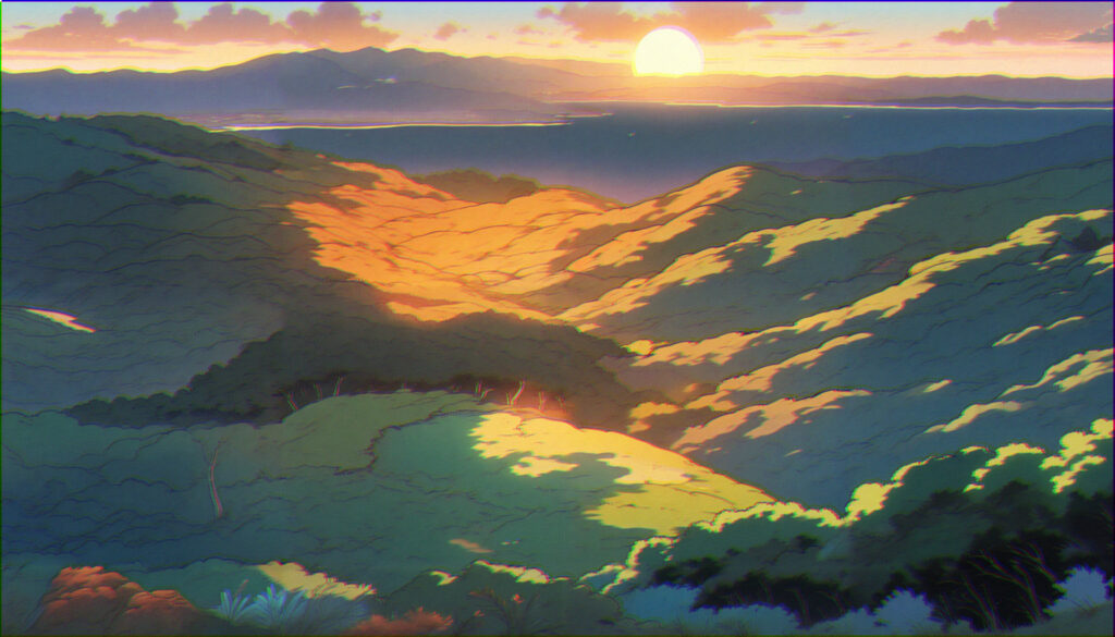 Traditional boats, outlined in neon, glide across the water, their reflections dancing in the ripples. The sound of taiko drums still resonates, now mixed with the synthetic hum of modernity, a symbol of the island’s conflicted identity.